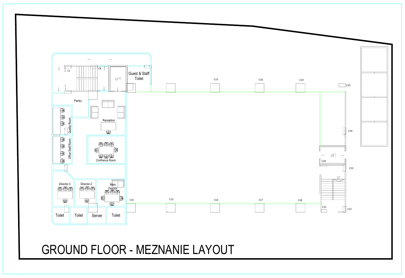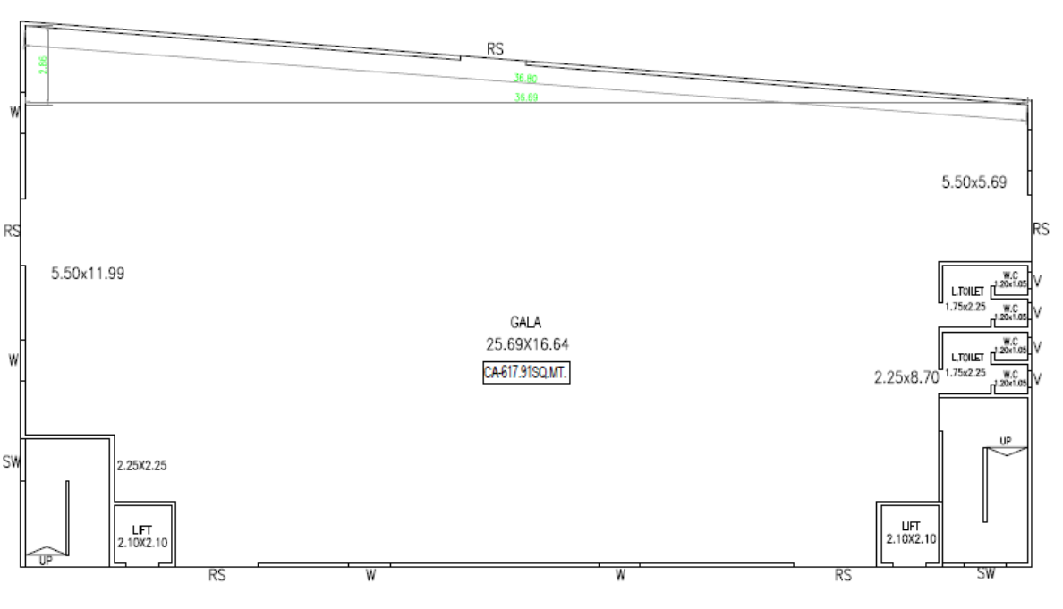 Mezzanine floor in ground section accommodating complete Office & Supporting Utilities Space needed by customer. Mezzanine floor being RCC Structural Slab, can accommodate all related weight without the need for mid-section support, by which shopfloor area is not disturbed and kept as clear usable area.
